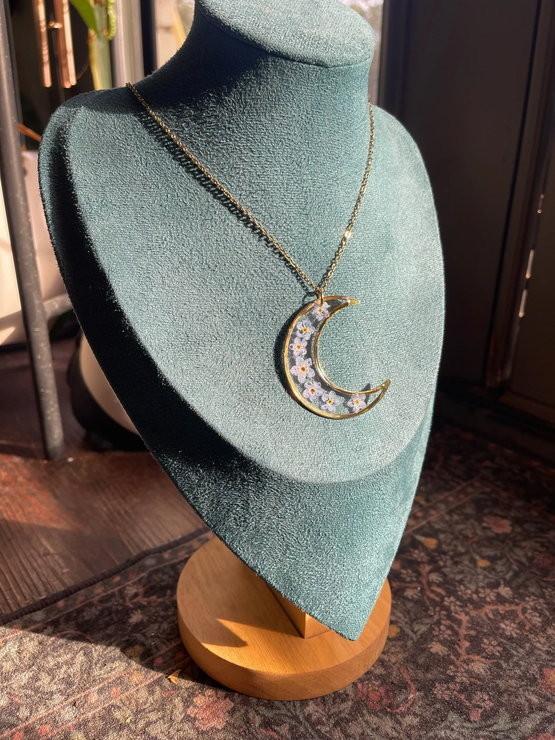Pressed forget me not flowers preserved in epoxy resin on hypoallergenic tarnish proof gold plated stainless steel. 18 inch long chain. One of a kind, handmade with love and intention.