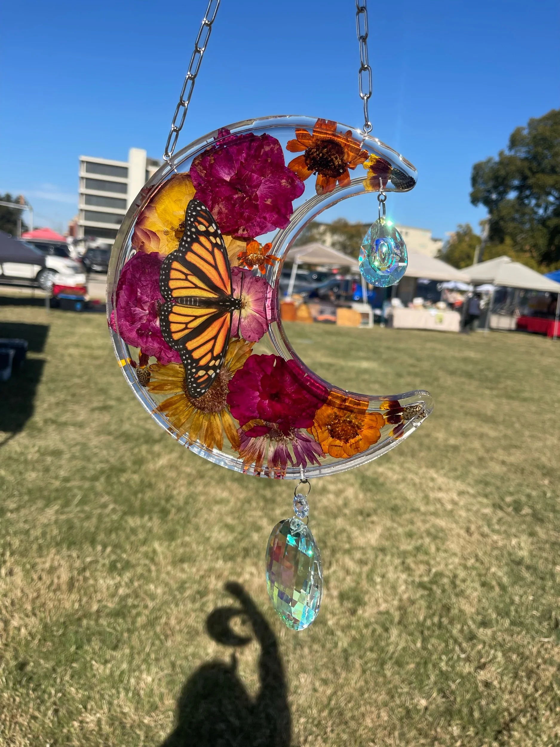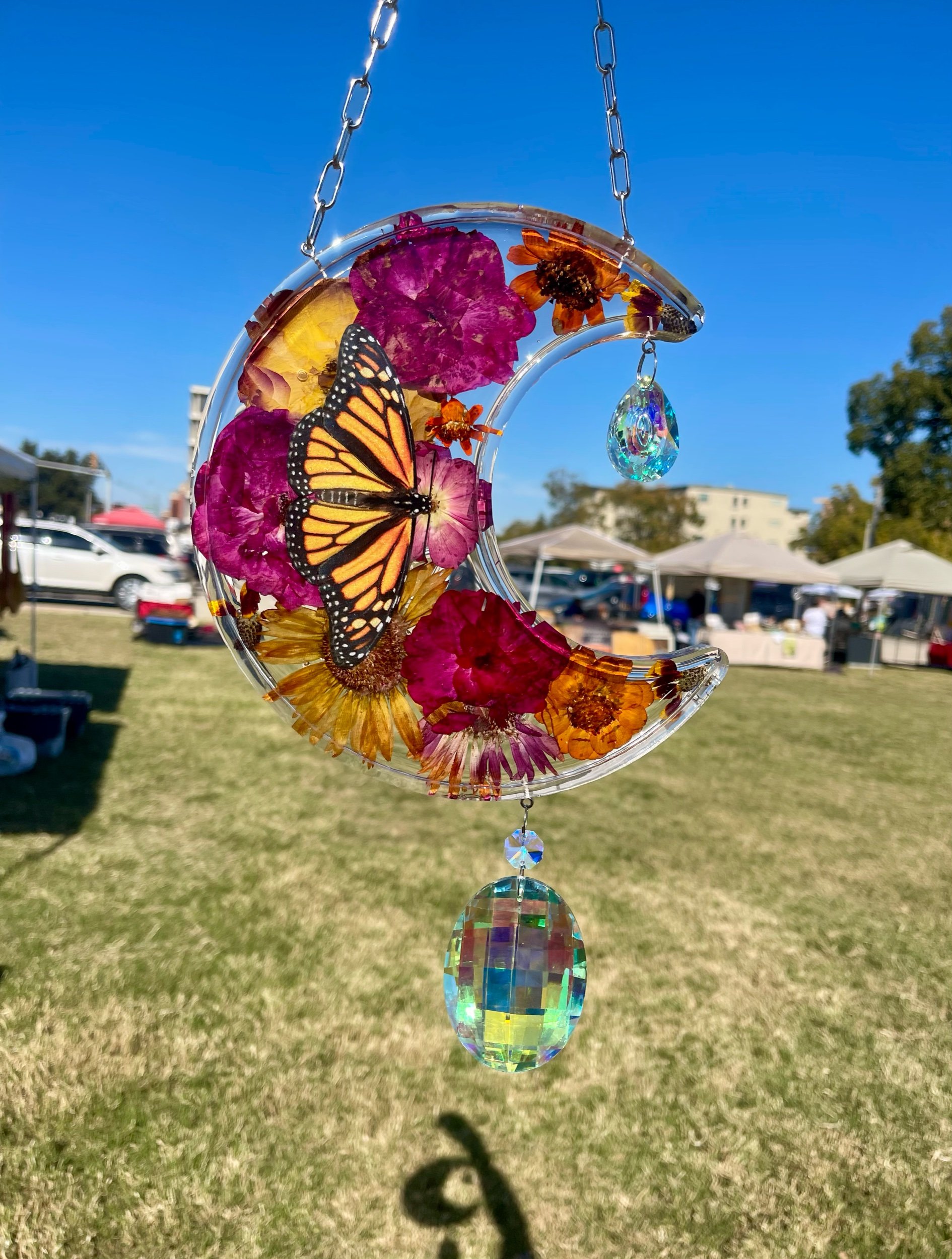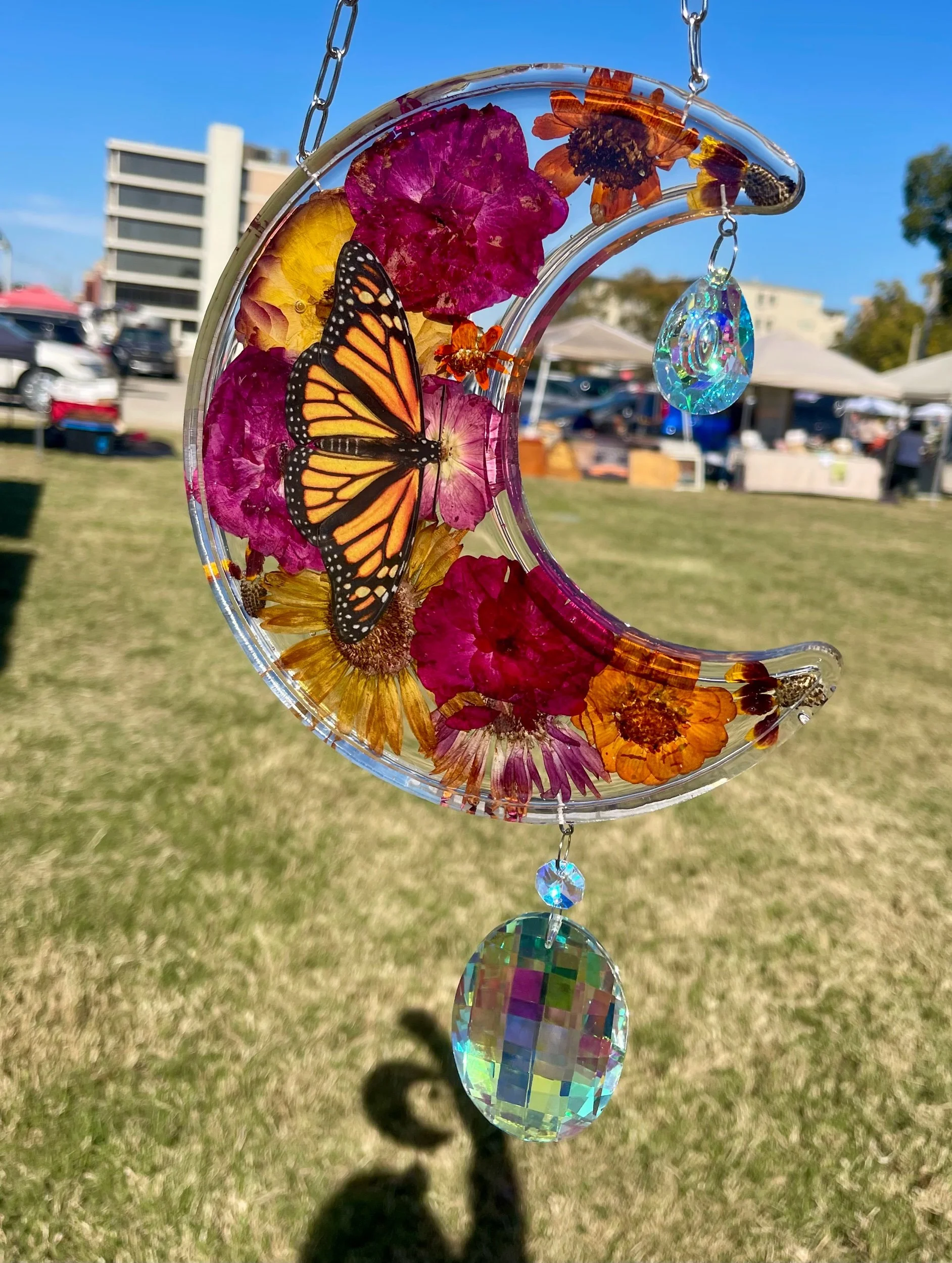Large moon suncatcher handmade with love by Candy. Totally one of a kind, filled with an arrangement of dried flowers from Candy’s garden and paper Monarch butterfly, preserved in top of the line UV resistant epoxy resin. Finished with stainless steel findings and coated crystal glass drops. Perfect for a sunny window. Will fill your home with rainbows if the sun catches it!